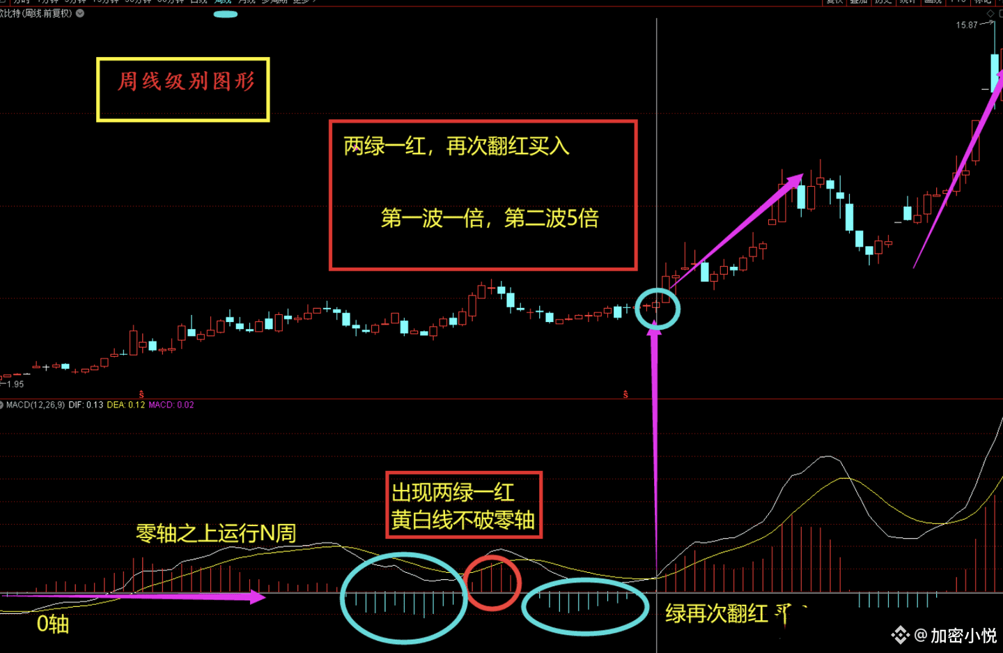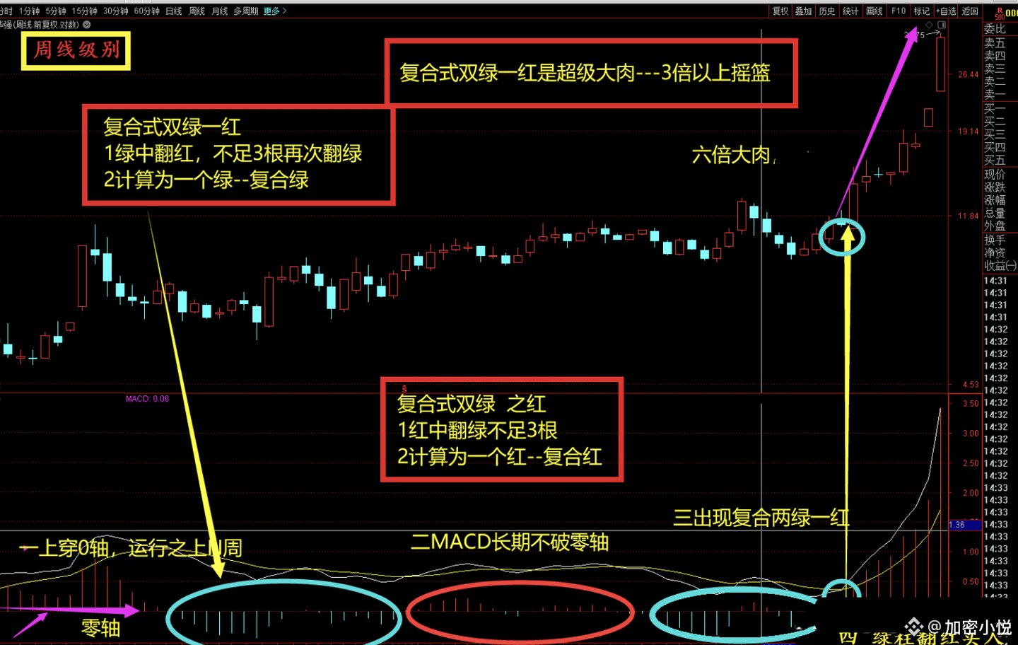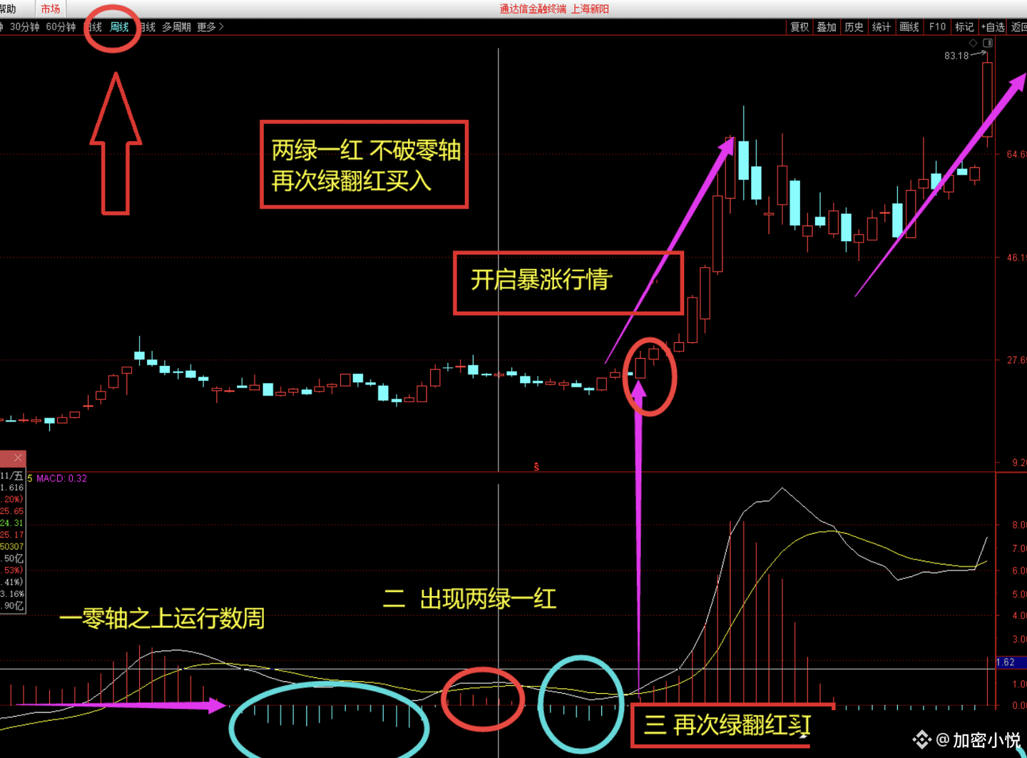 当一只个股在震荡的行情,MACD黄白两线始终保持在零轴的上方运行,红绿动能柱出现双绿一红,就是红色动能柱是被夹在中间,并且的话柱能必须是三根以上的量柱,再次出现红色动能柱就是很好的入场信号,股价将会迎来波段的上涨!