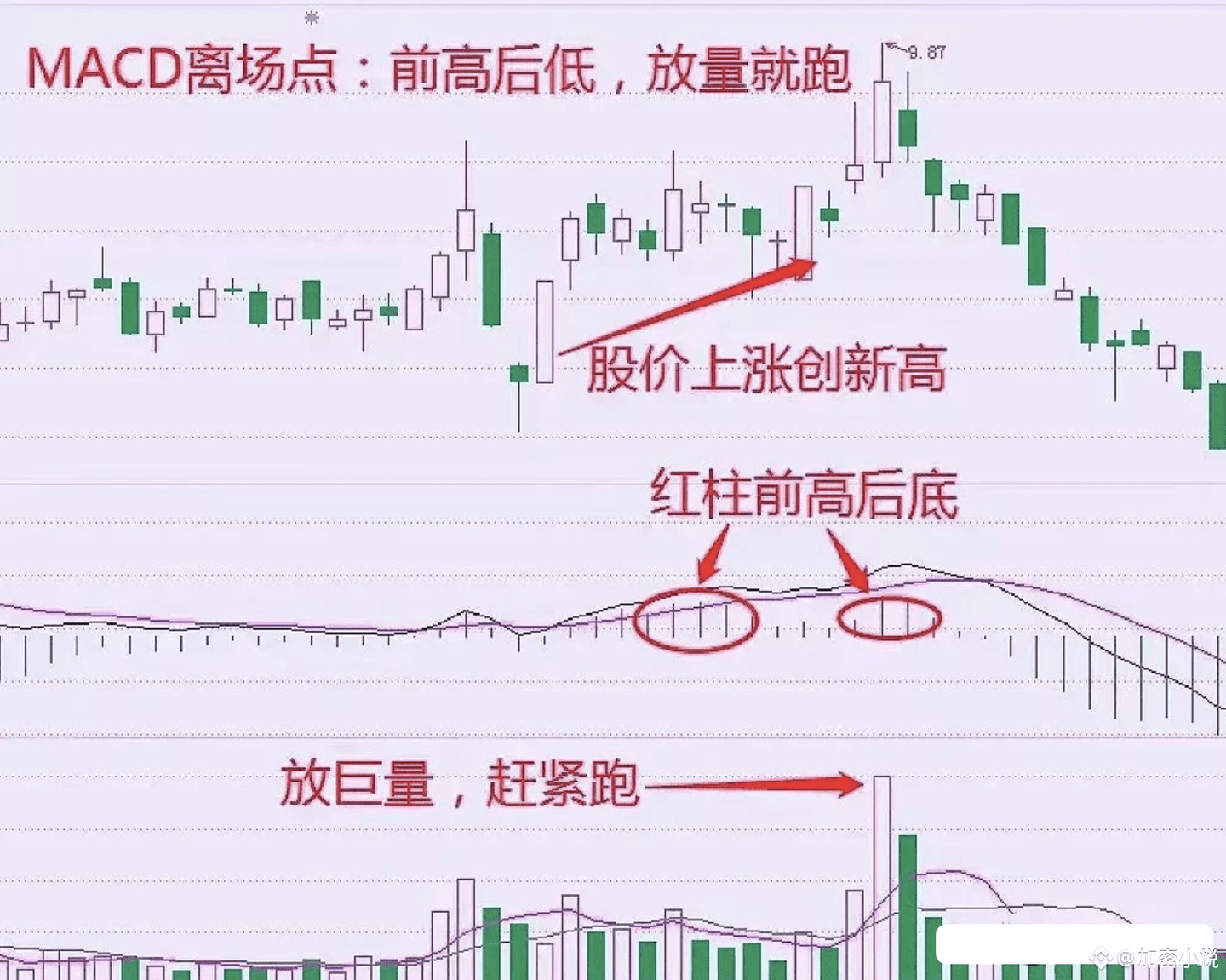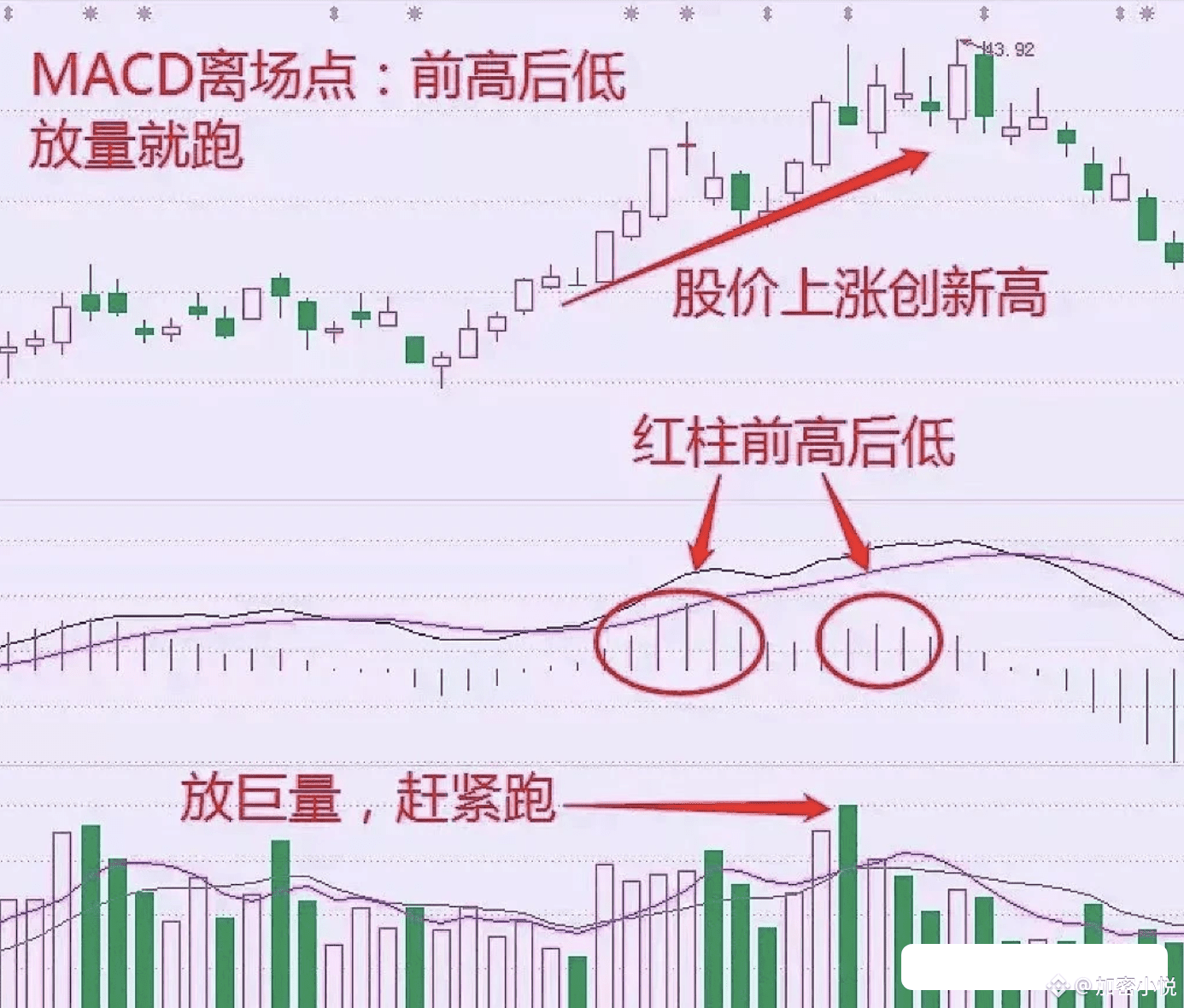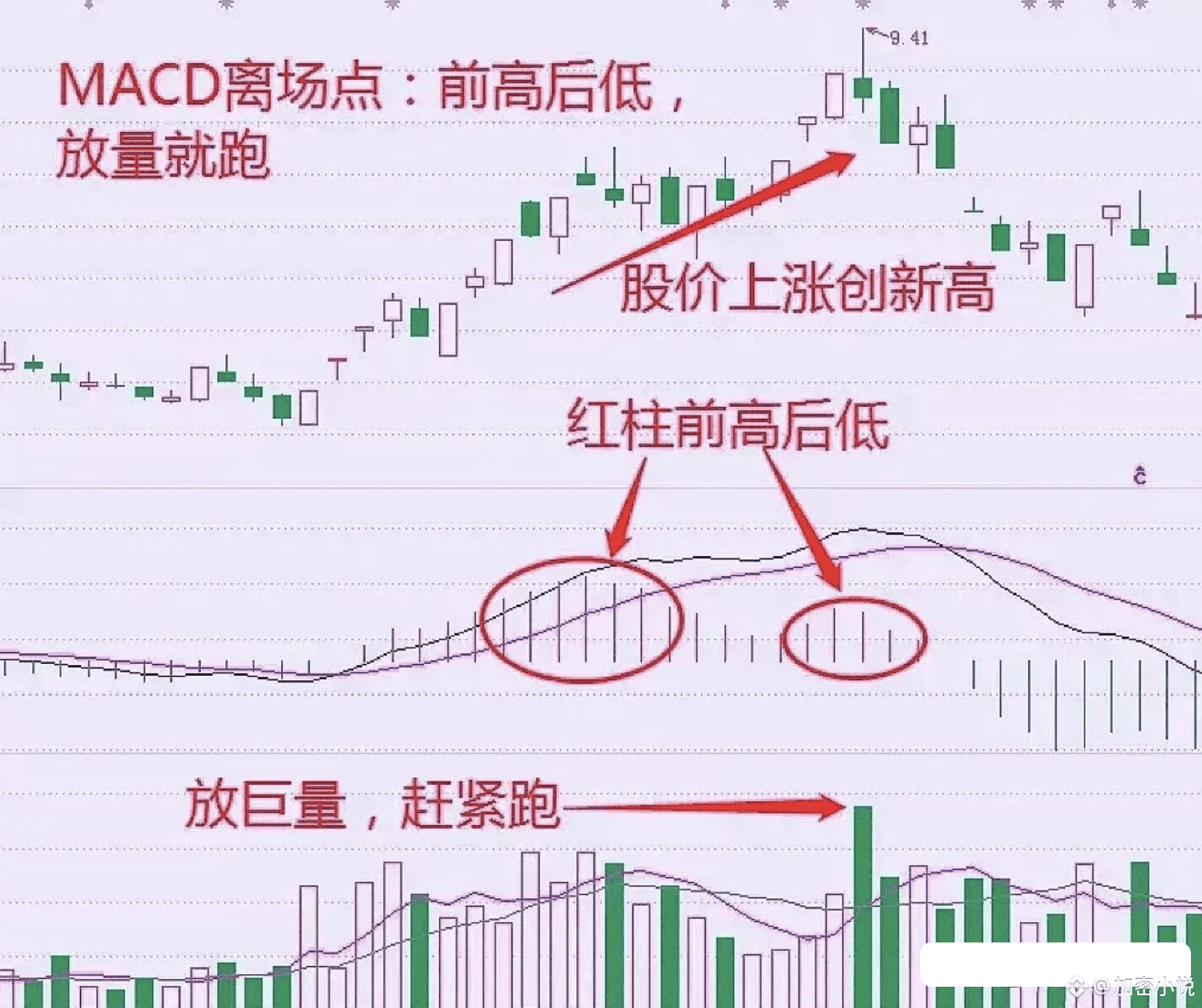 出局口诀:“前高后低,放量就跑”其实呢?这就是股价在上扬的过程中,股价不断地创新高,但是macd的能量柱逐渐地变小,红绿柱形成前高,后底的,且成交量放大,说明主力出逃,就是要离场的时候。