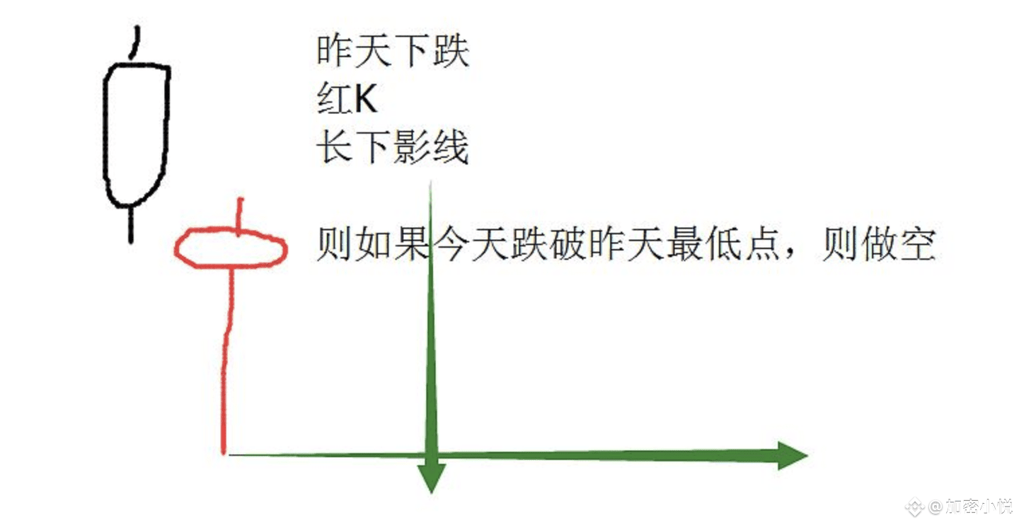 反过来,如果昨天下跌,但收盘价高于开盘价,且是长下影线,即是一个见底看多形态,如果今天跌破昨天最高价,则做空