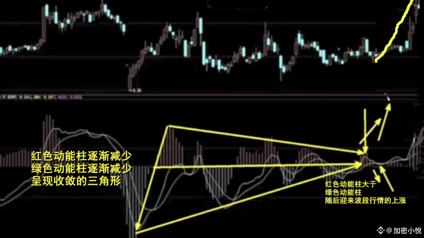 在一只个股在震荡或者下跌的趋势中 ,在红色动能柱的前期高点与低点链接成一条线,在绿色的动能柱的前期高点与低点链接成一条线,形成一个三角形的形态,如果后期出现红色的动能柱大于绿色的动能柱,表示主力洗盘结束,股价将会迎来一波的上涨行情,反之,如果是绿色的动能柱大于红色的动能柱,表示股价仍然需要整理,股价还会继续的下跌。