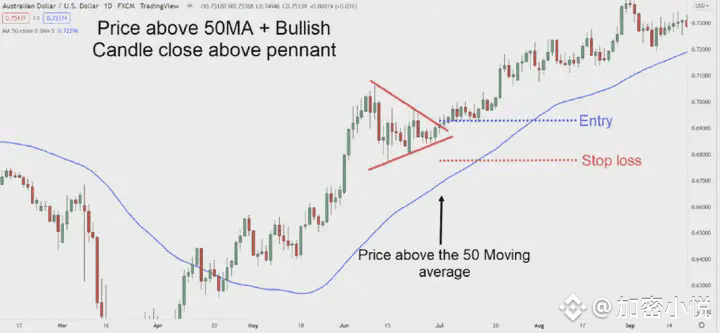 若市场价格位于50周期移动平均线之上,我们则开始寻找公牛三角旗形态的交易机会,相反,如果市场价格低于50周期移动平均线,我们则应避免进行交易。当市场出现公牛三角旗形态的机会时,我们应如何操作?在此情况下,我们需等待价格形成一根看涨蜡烛并收盘,同时在牛市三角旗形态的下方设置止损点,如下图所示。