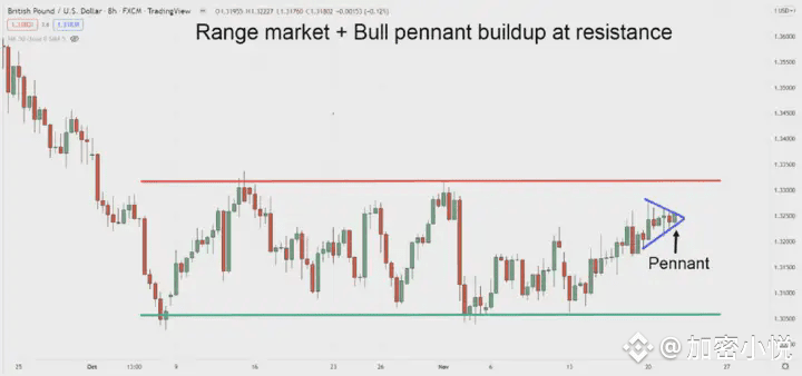 那么,在区间震荡市场中,我们应如何进行交易?实际上,我们的策略是避免在区间市场进行交易,这表示我们不会试图在区间的顶部和底部进行买卖操作,相反,我们会在区间市场即将结束时保持观望,例如,寻找在阻力位形成的牛市三角旗模式,以此作为潜在的交易信号,如下图所示。