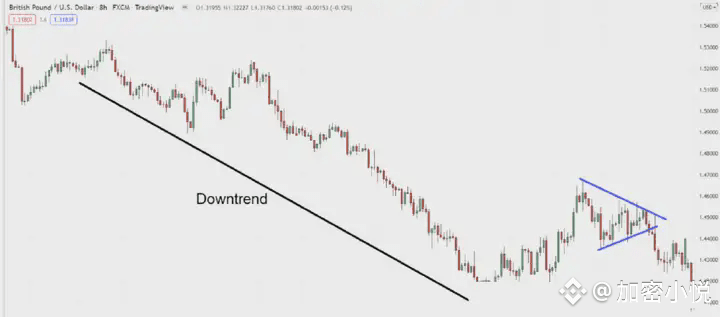 您可能会产生疑问:您之前提到牛市三角旗是一种趋势延续形态,为何我们会在下降趋势中应用它?