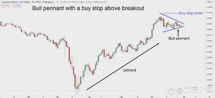 因此,在您下次识别出牛市三角旗模式时,请制定以下清单以供参考:我是否正在考虑交易一个有效的牛市三角旗模式?我是否在市场上升趋势中进行此牛市三角旗模式的交易?然而,您究竟打算如何进入牛市三角旗模式的交易?您是否已经设定了入场规则?若答案是否定的,那么,如何正确进入牛市三角旗模式的交易呢?您应在突破点上方下达一个买入止损订单,如下图所示。