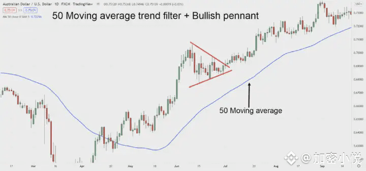 首先,必须掌握如何客观地识别上升趋势的方法,如果不能准确界定市场趋势,那么建立在牛市三角旗形态上的交易策略可能会遭遇失败。那么,应采取何种措施呢?我们可以通过应用趋势过滤器,例如采用50周期移动平均线来实现这一目标,如下图所示。