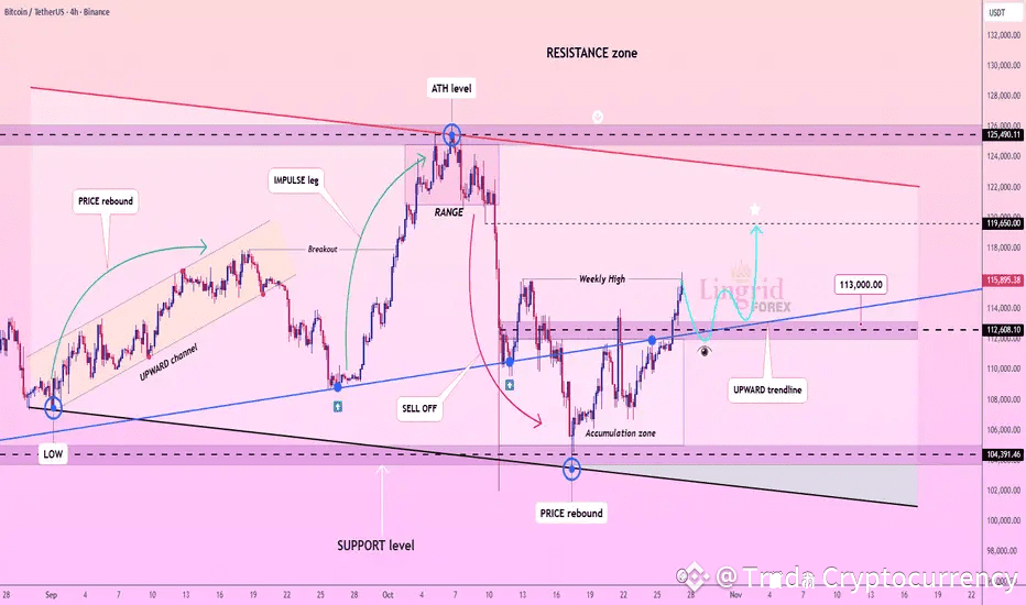 BTCUSDT is rebounding sharply from the support level after rebounding above the accumulation zone, signaling renewed bullish momentum. The market structure forms an upward channel supported by a dynamic trendline that aligns with previous impulse legs. A sustained move above 113,000 could confirm a continuation toward the key resistance area near 119,650.Broader momentum points to buyers regaining control as Bitcoin builds strength for a potential breakout from consolidation.