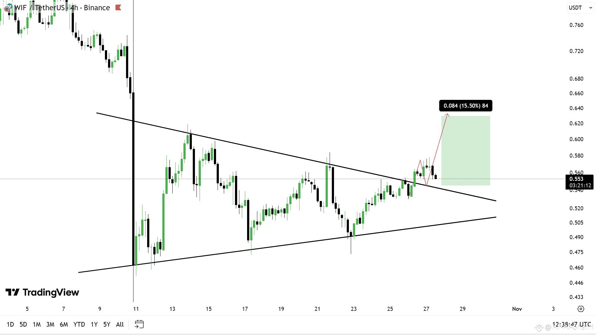 حدث اختراق 📈 من المثلث المتناظر في إطار زمني مدته 4 ساعات.