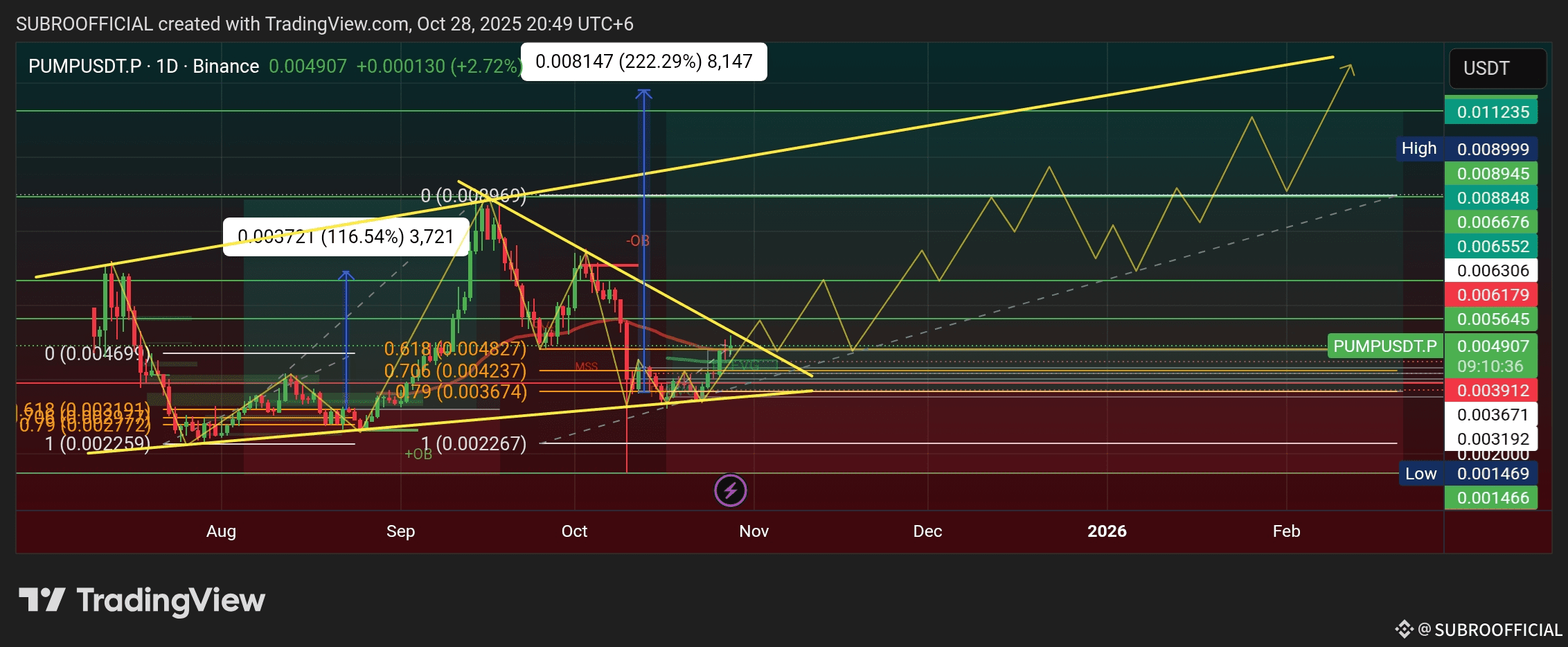 From a short-term technical viewpoint, the PUMP price chart showed significant strength in Q3, marked by a breakout from a slanted double-bottom pattern. This bullish momentum successfully drove the price to an All-Time High (ATH) of $0.00899 by mid-September.