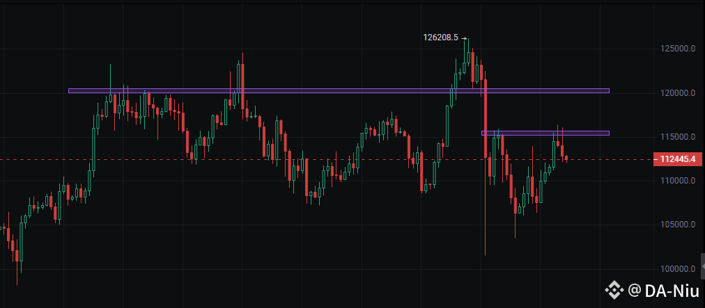 但事与愿违,昨天也按照预期二次冲高了,不过最高只到116000附近,形成一个次高点后快速砸盘,然后再晚间时刻反弹二次测试到115000附近受阻后大幅下跌,虽然没有跟上,但整体节奏还是在预期之中,日线倒纺锤后收阴,今日整体会偏弱势下行,不过价格也即将来到几个关键支撑位。