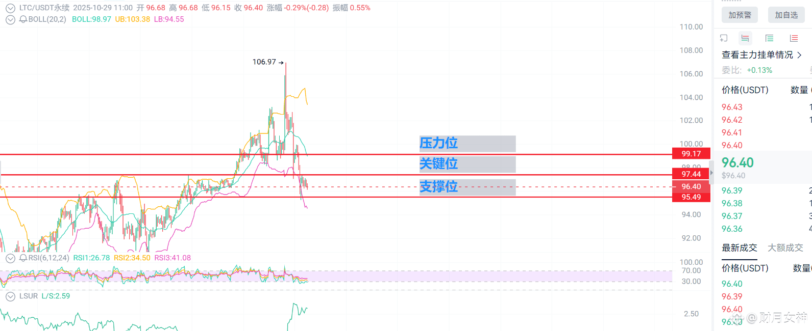 支撑位:95.49美金(生死线)、96.40美金(当前价格附近)压力位:97.44美金(短期天花板)、99.17美金(主力出货区)RSI指标:26.78,超卖区域!但别急着抄底——主力挂单委比+0.13%,说明多空博弈正酣!