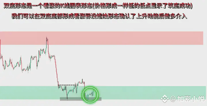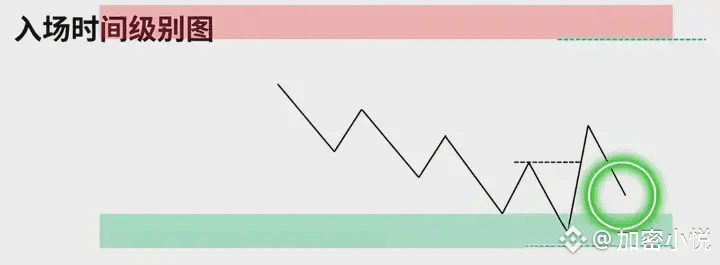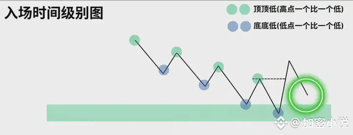 第三步,入场级别找“趋势破坏+形态确认”:在入场级别里,价格跌到支撑位前是“顶顶低、底底低”的下跌结构;但抵达支撑位后,不仅没续跌,反而突破前期高点(趋势破坏),还形成了“双底形态”——这是经典的看涨形态,两个低点差不多高,说明“筑底成功”。