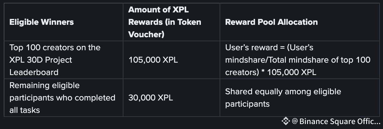 All verified Binance users can complete the following tasks to unlock a share of 135,000 XPL in token vouchers. In addition, 15,000 XPL token vouchers will be allocated to the top 50 creators on the Square Creator Leaderboard based on the 7-day rankings at the Activity launch date.