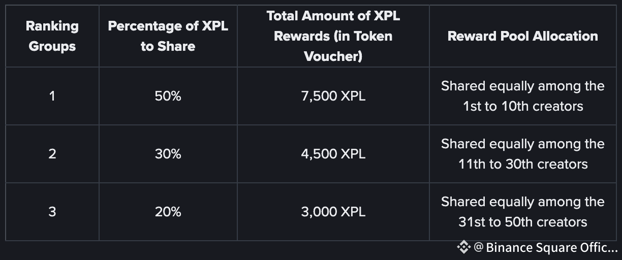 The top 50 creators will be eligible for this additional 15,000 XPL prize pool. This reward is based on the 7-day rankings at the Activity launch date on the Square Creator Leaderboard. The 15,000 XPL will be split into three ranking groups, as per the table below:
