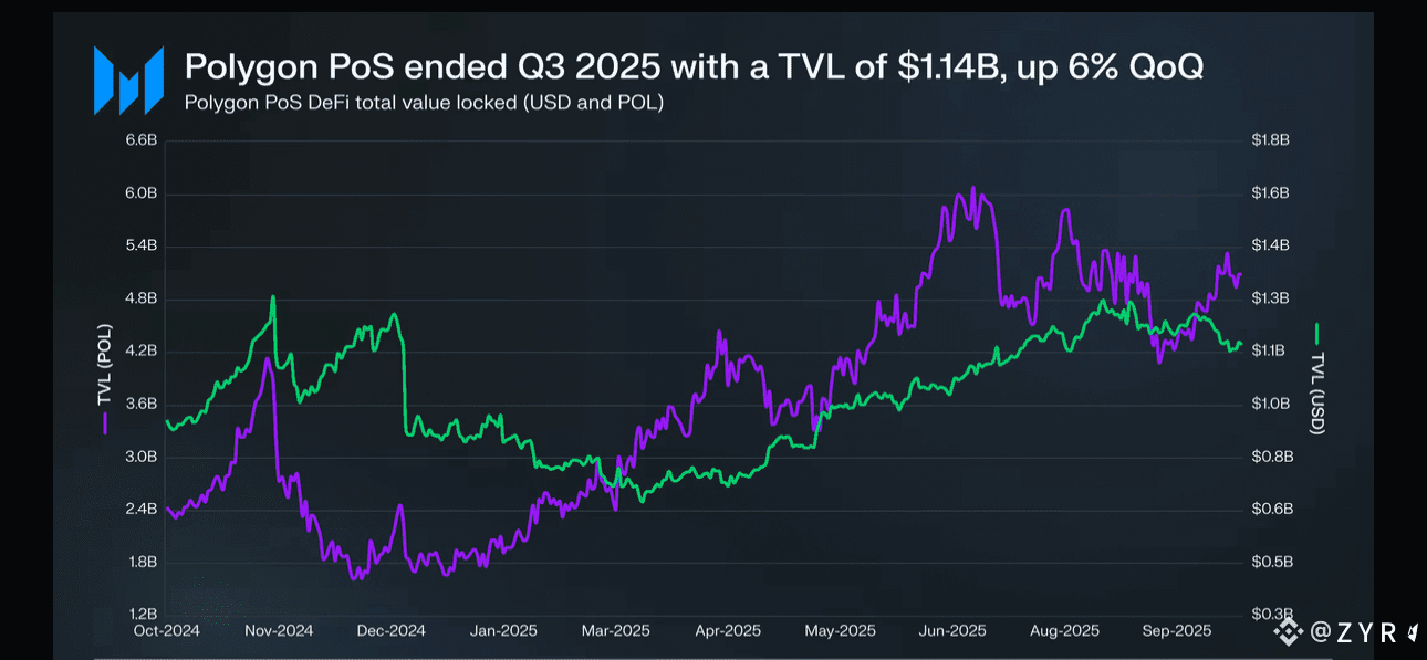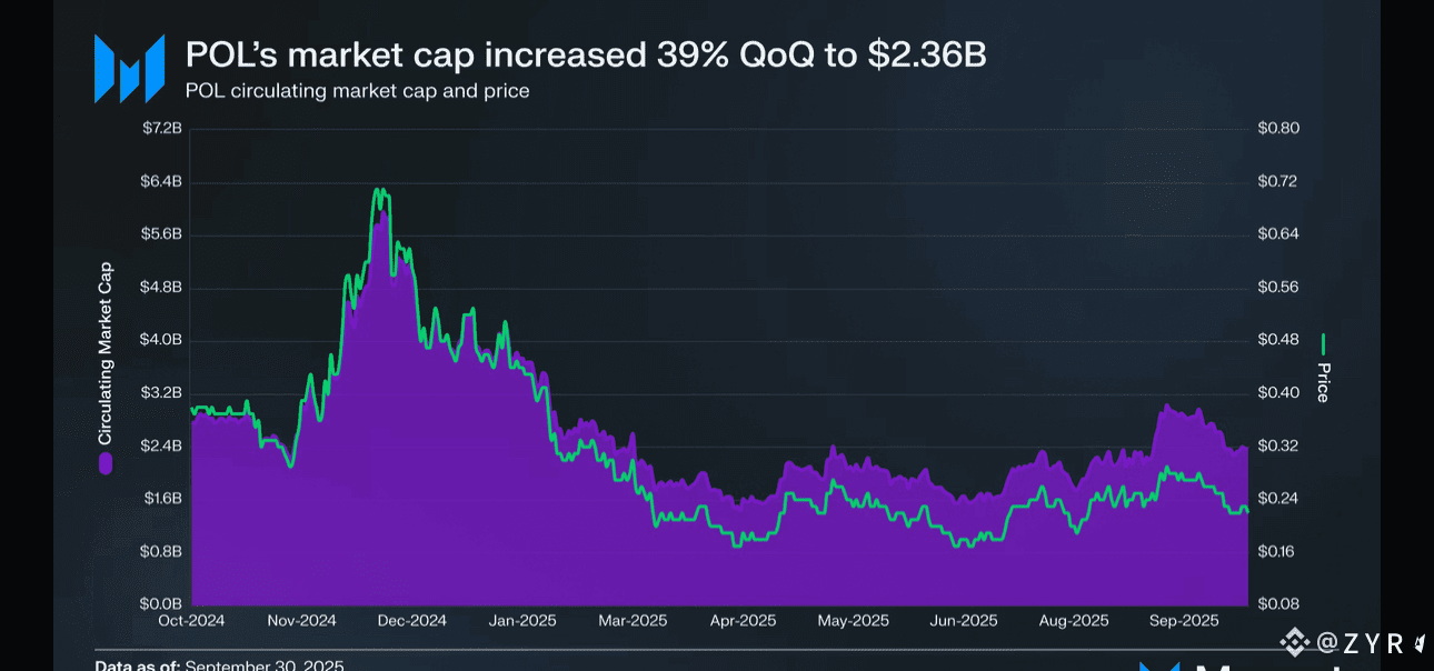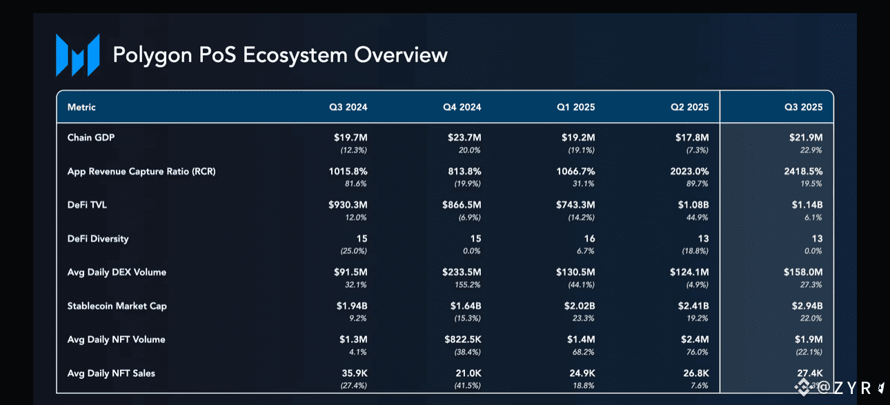 There are quarters when metrics rise because markets rise and there are quarters when numbers increase because something deeper has shifted in how a network is used. Q3 2025 for @Polygon was the second kind. The growth across POL market cap, stablecoin settlement, DeFi liquidity and real-world asset issuance did not emerge from speculative momentum alone. It reflected a network that is beginning to settle into its role: an economic layer where payments, capital markets and on-chain commerce operate alongside consumer-scale applications. What stands out in this quarter is not merely growth, but coherence. The ecosystem is not expanding randomly. It is expanding with direction.