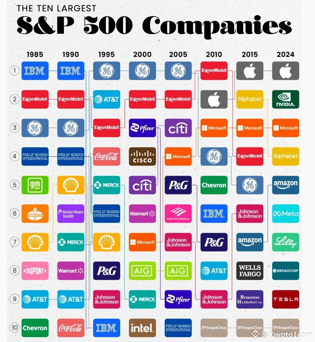 The 10 largest companies in the S&P 500 by their share of the S&P 500's total market cap from 1985 to 2024.