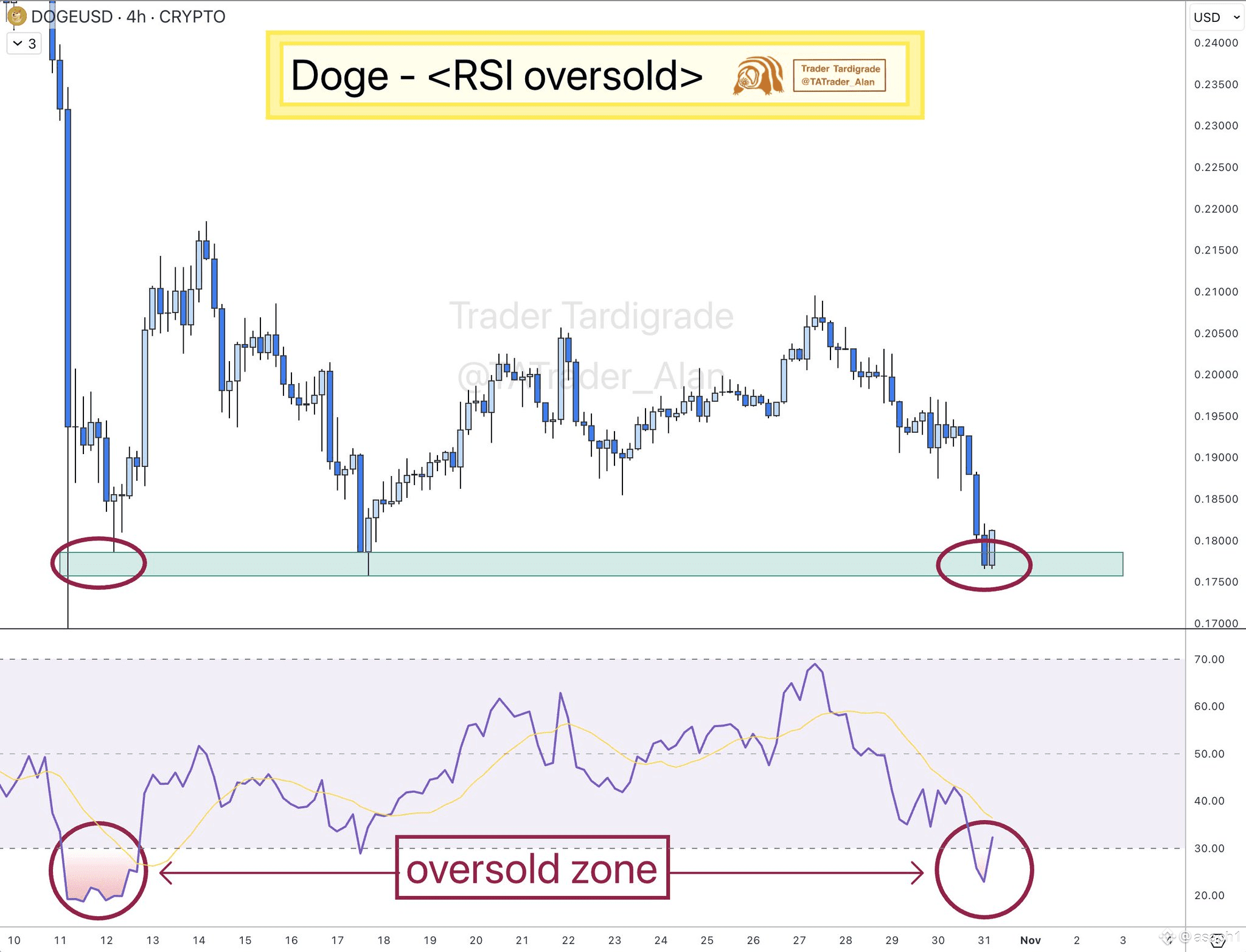 RSI en Modo "Oversold" (Sobrevendido): Abajo, el RSI (Índice de Fuerza Relativa), que mide el sentimiento y el momentum, acaba de entrar a la famosa zona de sobreventa (debajo de 30). Esto históricamente ha sido una señal de que la venta ha sido demasiado agresiva y que un rebote (una subida de precio) podría estar cerca. La primera vez que tocó esta zona (círculo a la izquierda), el precio subió. ¿Será que la historia se repite? 🔄