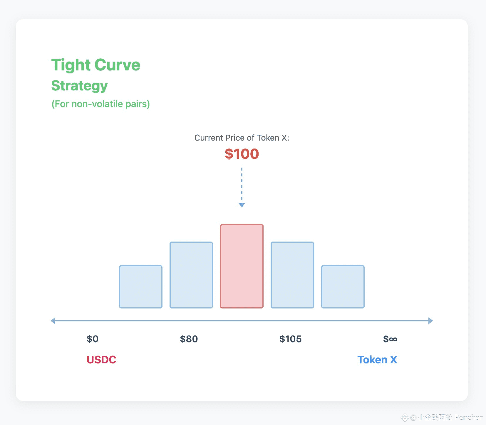 - 曲線策略:流動性集中範圍中間的倉位,兩邊遞減,適合穩定幣對