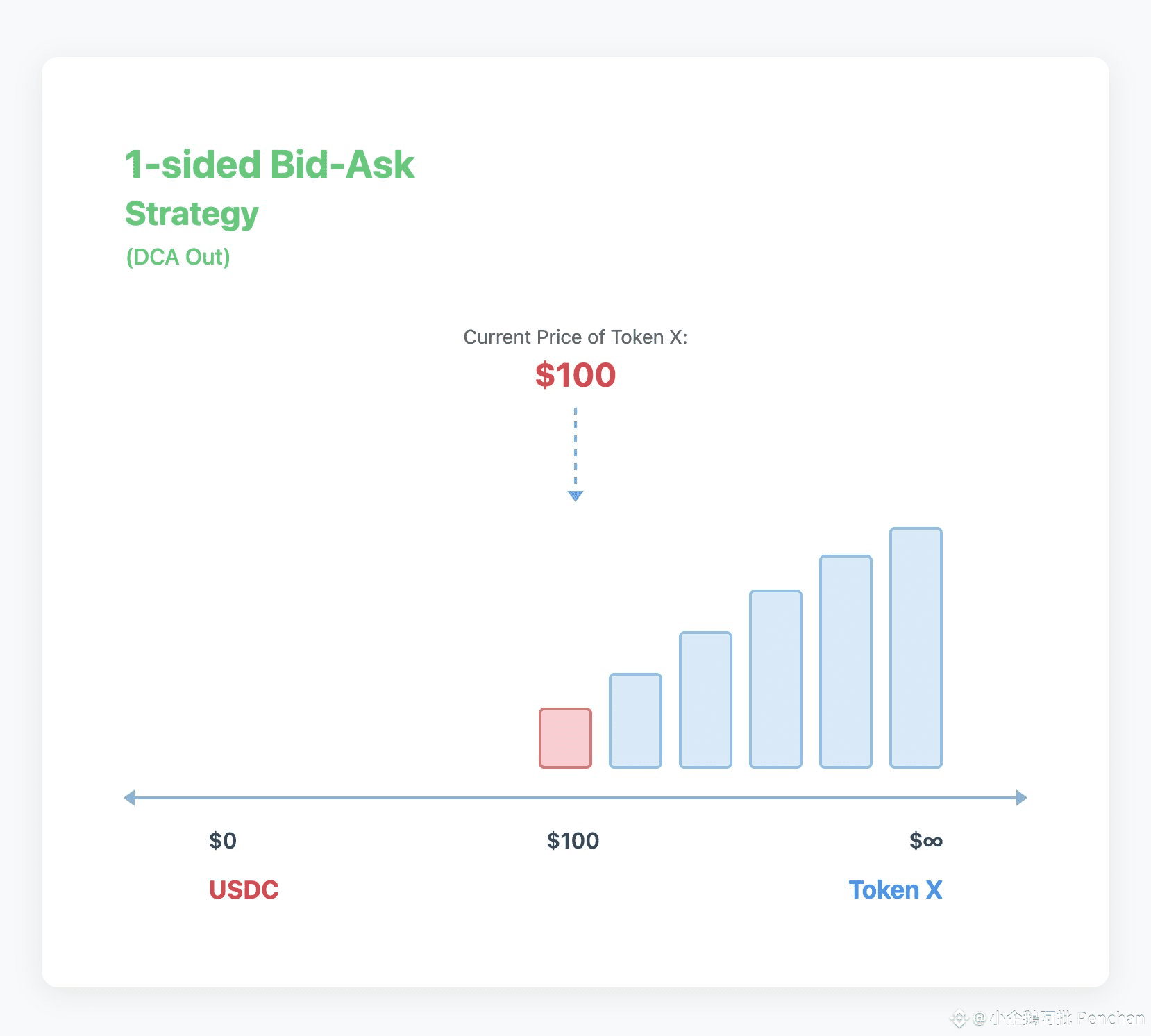 - 單邊策略:流動性邊緣最多,向中間遞減,適合波動大的資產,能抓到價格的擺動並減輕無常損失。適合 DCA 買或賣的交易策略,比如持有 $BTC 等待上漲陸續賣出,同時還賺取手續費