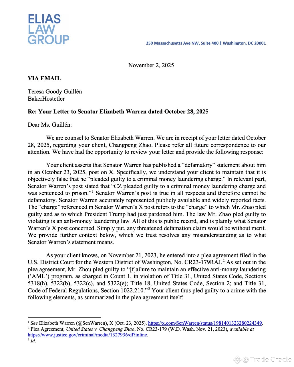💥 The legal sparks are flying! Sen. Elizabeth Warren’s legal team just clapped back at Binance founder Changpeng “CZ” Zhao’s defamation threat — calling it “without merit.”