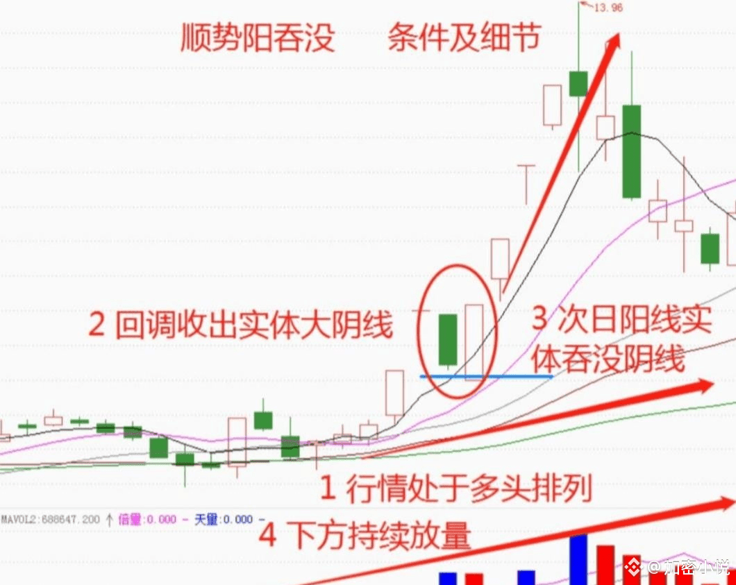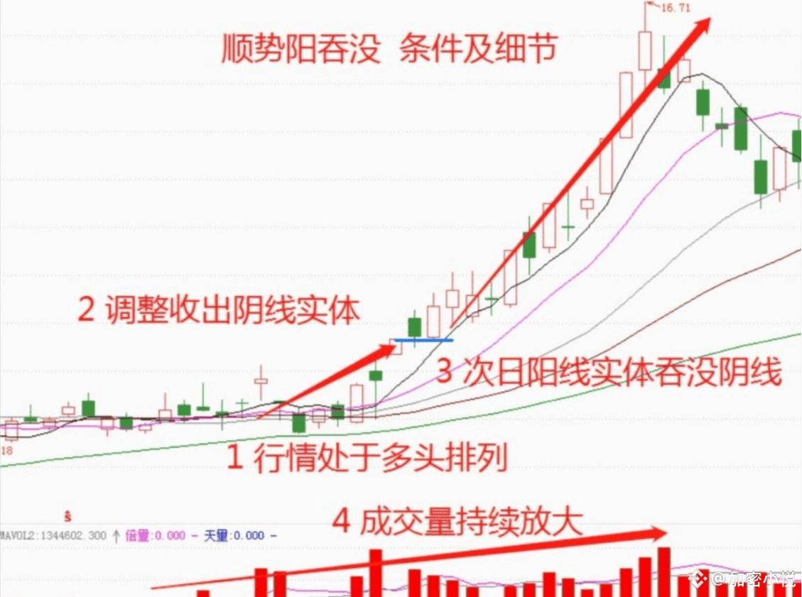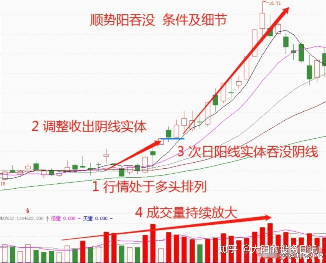 “顺势阳吞没”的形态首先要确认的是就是趋势,一定要是确立是多头的上涨趋势,在趋势的中段出现了一个调整确认的阳包阴形态,而在这个阶段,整个上涨的多头趋势并未受到影响。