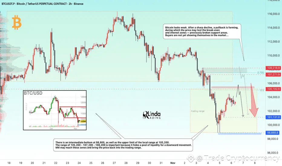 Bitcoin looks weak. After a sharp decline, a pullback is forming, during which the price may test the break-even and interest zones — previously broken support areas. Buyers are not yet showing themselves in the market...