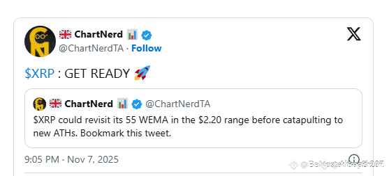 $XRP Technical analyst ChartNerd has renewed focus on XRP’s interaction with the weekly 55-period weighted exponential moving average (55 WEMA). He reiterated an earlier view that the price may revisit the 55 WEMA in the low $2.20s before initiating a new leg higher.