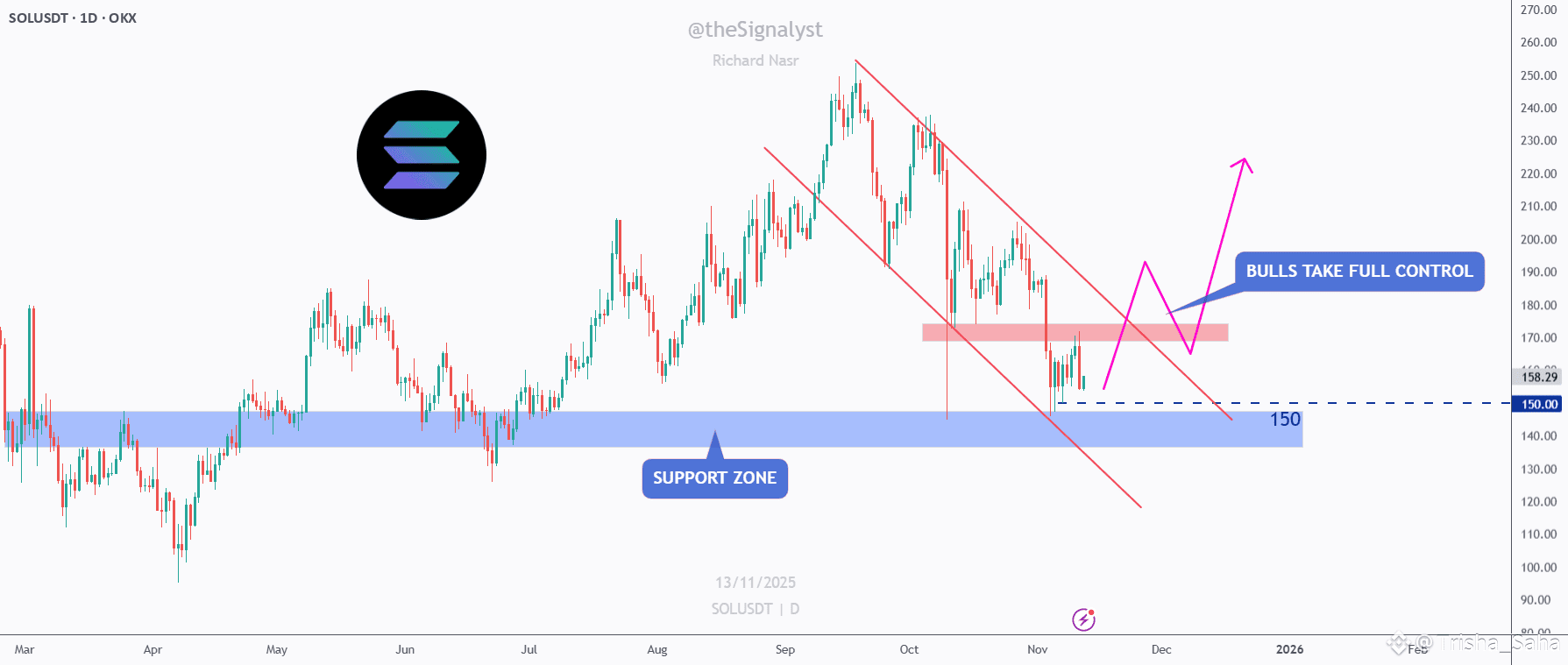 After weeks of selling pressure, SOL is finally approaching a massive confluence zone around the $150 round number, which aligns perfectly with a strong weekly support area highlighted in blue.