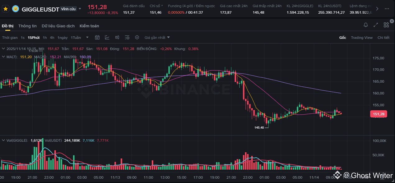 $GIGGLE đang giao dịch quanh 150–155 USD, giảm 8.2% trong 24 giờ và mất 28% trong 7 ngày.