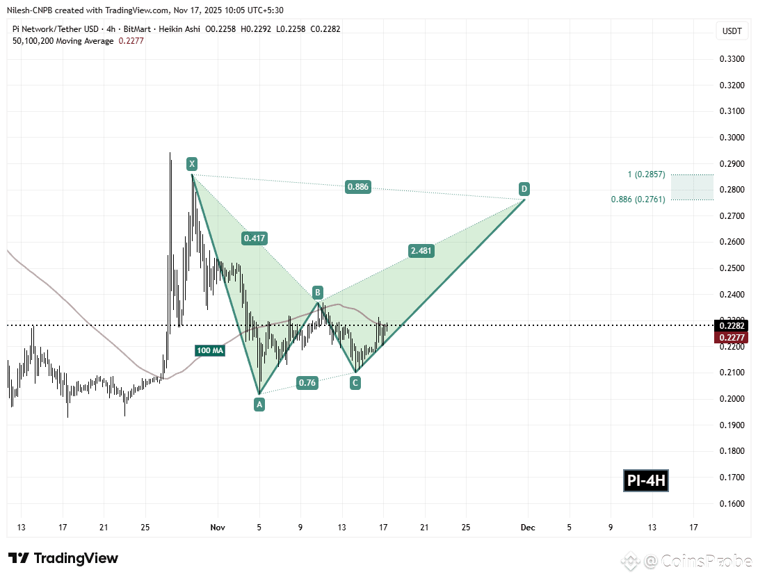 The pattern began at Point X near $0.2857, followed by a sharp sell-off toward Point A, a recovery into Point B, and a second corrective leg into Point C around $0.2101. From that point, PI has shown a steady recovery, now trading near $0.2282, suggesting early signs of building bullish momentum.