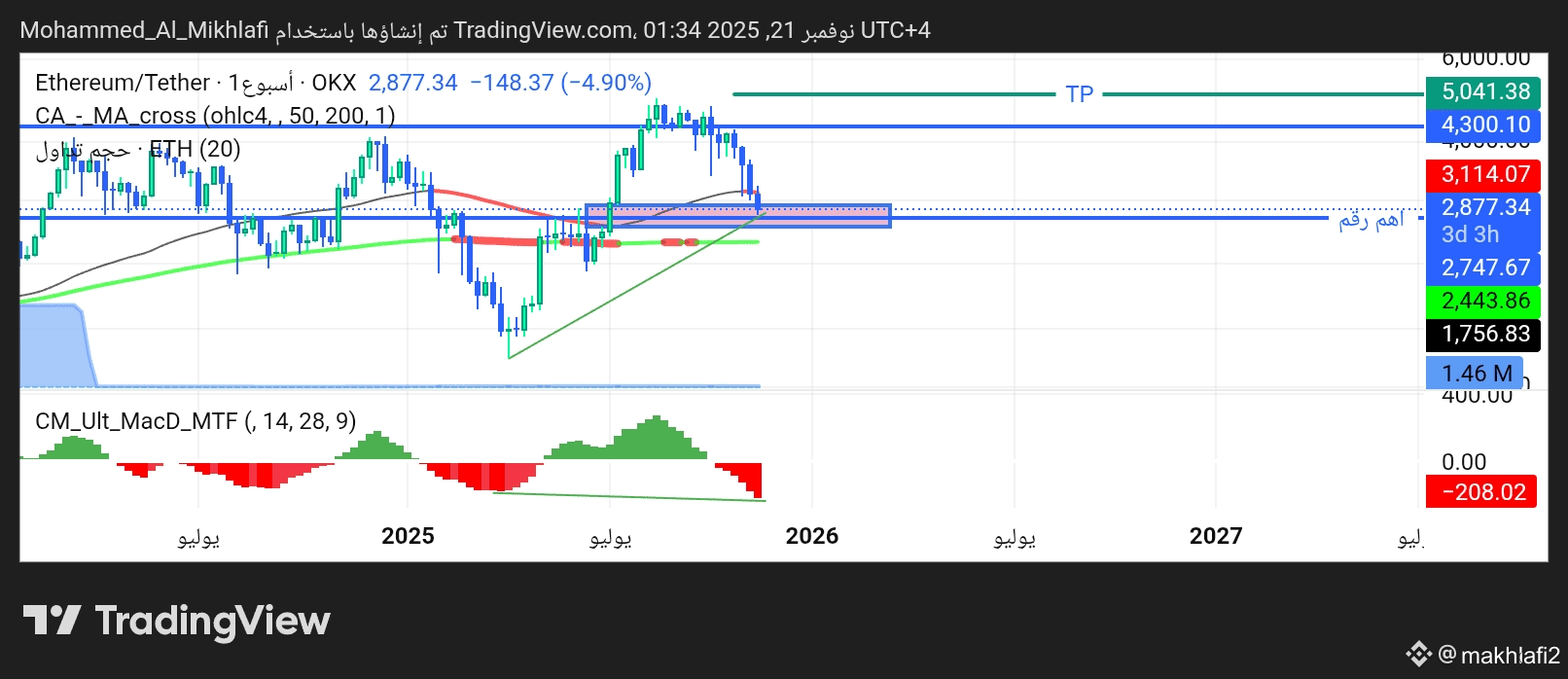 الإيثريوم بعد موجة صعود قوية ومتسارعة دخل في تصحيح طبيعي. وكانت أول إشارة على تصحيح عميق هي الإغلاق الأسبوعي أسفل مستوى 3600، وهو ما فتح المجال للهبوط نحو 3000 كما كان متوقعًا.