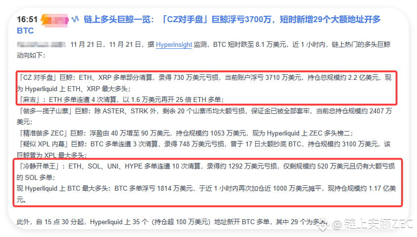 先看几个典型案例:那个叫“CZ对手盘”的巨鲸,ETH和XRP多单被清算,亏了730万美元,浮亏加起来快3710万了,但人家还是Hyperliquid上ETH和XRP的最大多头,持仓2.2亿美元没怂!还有“麻吉”,ETH多单被爆了4次,转头又拿1.6万美元开25倍杠杆继续冲,这狠劲真让人佩服。更绝的是,Hyperliquid上35个持仓超百万的地址,29个都在新开BTC多单,这说明啥?巨鲸们觉得跌到底了,在疯狂抄底呢!