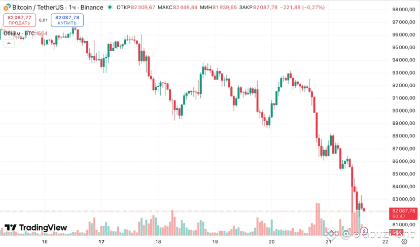 وقت كتابة هذا التقرير كان سعر العملة المشفرة الرائدة يُتداول عند حوالي 82,000 دولار أمريكي. وخلال الأربع والعشرين ساعة الماضية انخفض سعرها بنسبة 10.6%