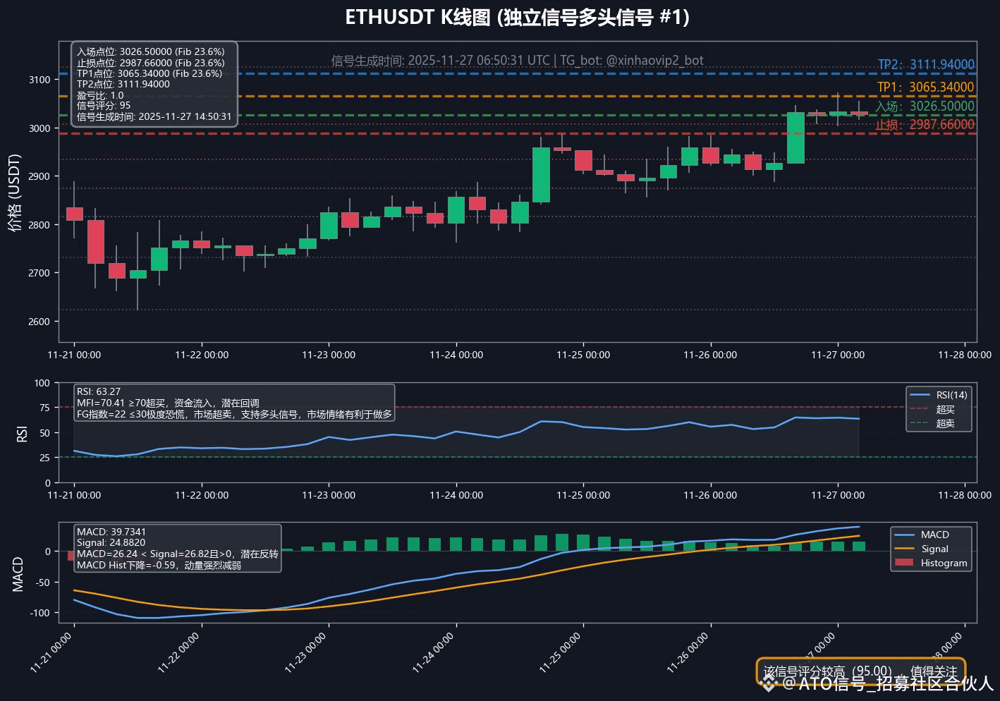 - FG指数=22 ≤30极度恐慌,市场超卖,支持多头信号,市场情绪有利于做多