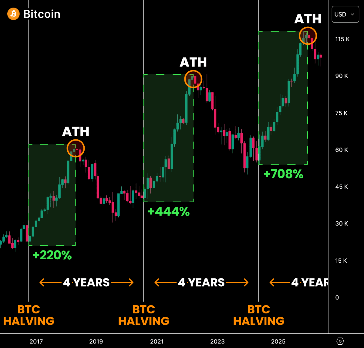 Every one of those events has historically pushed Bitcoin higher within 3–6 months.