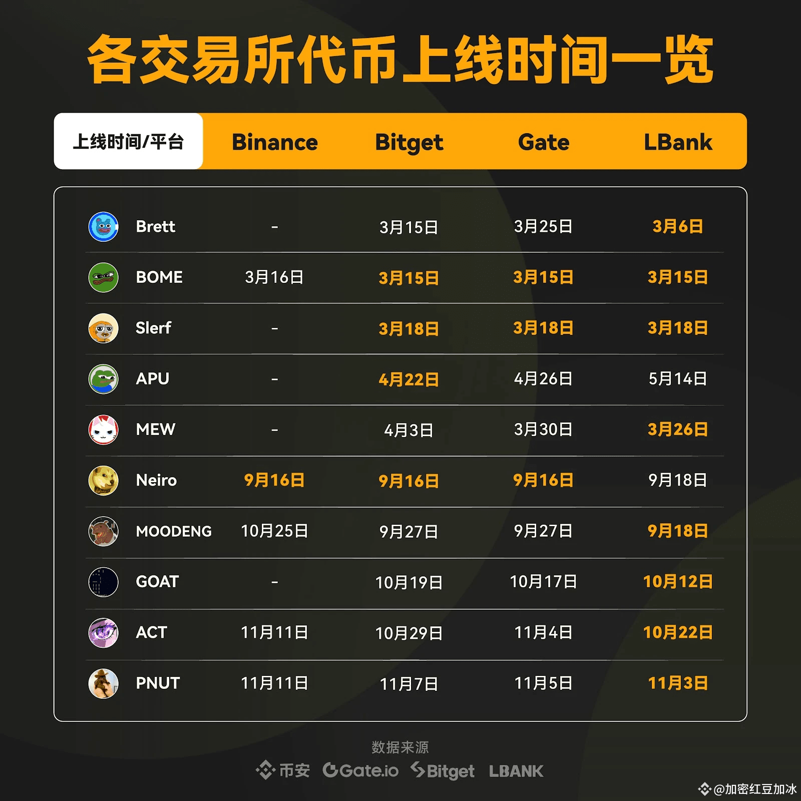 而 LBank 堪称最早嗅到变革气息的交易所之一。早在 2023 年就布局 Meme 赛道,推出 1000 万美元的 meme 专项基金,并在 2024 年重点发力,上线 Moodeng、Goat、ACT、Slerf 等热门币种,均实现超 50 倍的涨幅,成功实现弯道超车,相较于 Gate、Bitget 等交易所,更显大胆且精准把握了信息差和时间差。