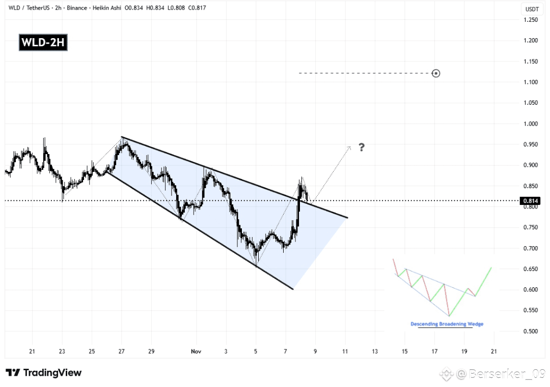 As shown in the 2-hour chart, WLD had been consolidating inside a descending broadening wedge — a classic bullish reversal pattern known for signaling exhaustion in downtrends.