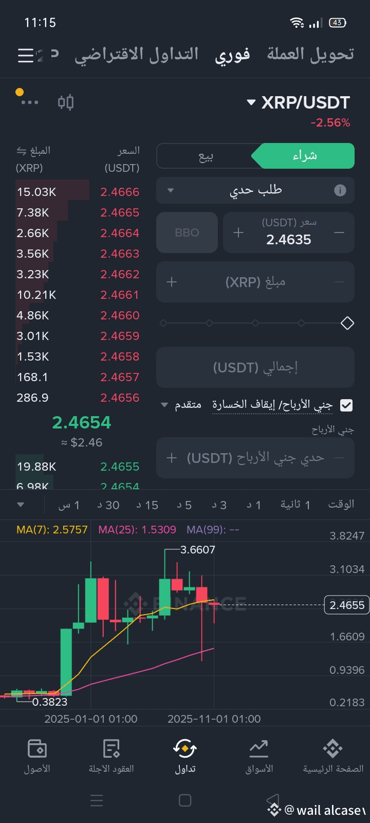 🔴 دعم المتوسط المتحرك (MA 7): السعر الحالي ($2.465) أصبح أقل من المتوسط المتحرك لمدة 7 أيام (2.5757). هذا يعتبر إشارة بيع ضعيفة. إذا لم يرتد السعر فوق 2.50 سريعاً، فسنرى المزيد من الهبوط.