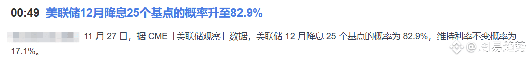 先看宏观面!美联储12月降息概率飙到82.9%,这意味着全球资金可能要“开闸放水”!历史经验告诉我,降息预期一旦升温,比特币、ETH这些高风险资产往往率先起飞!所以,大环境对币圈是妥妥的利好!