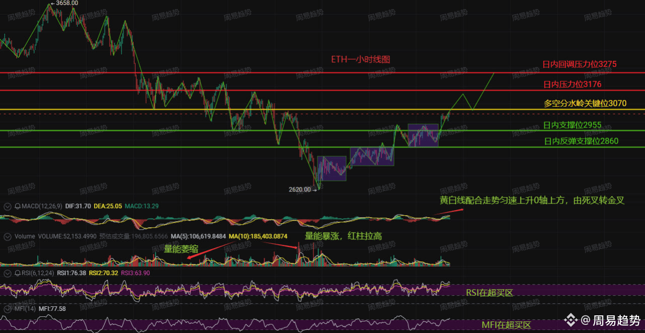 现在ETH一小时图很微妙——昨晚消息面一出,eth就立马暴涨!而且MACD在0轴上方刚形成金叉,这是上涨的明确信号,但RSI和MFI都进了超买区,说明追高风险越来越大。上方3275是强压力,下方3070是关键支撑。大方向肯定看涨,但短期必有剧烈震荡!