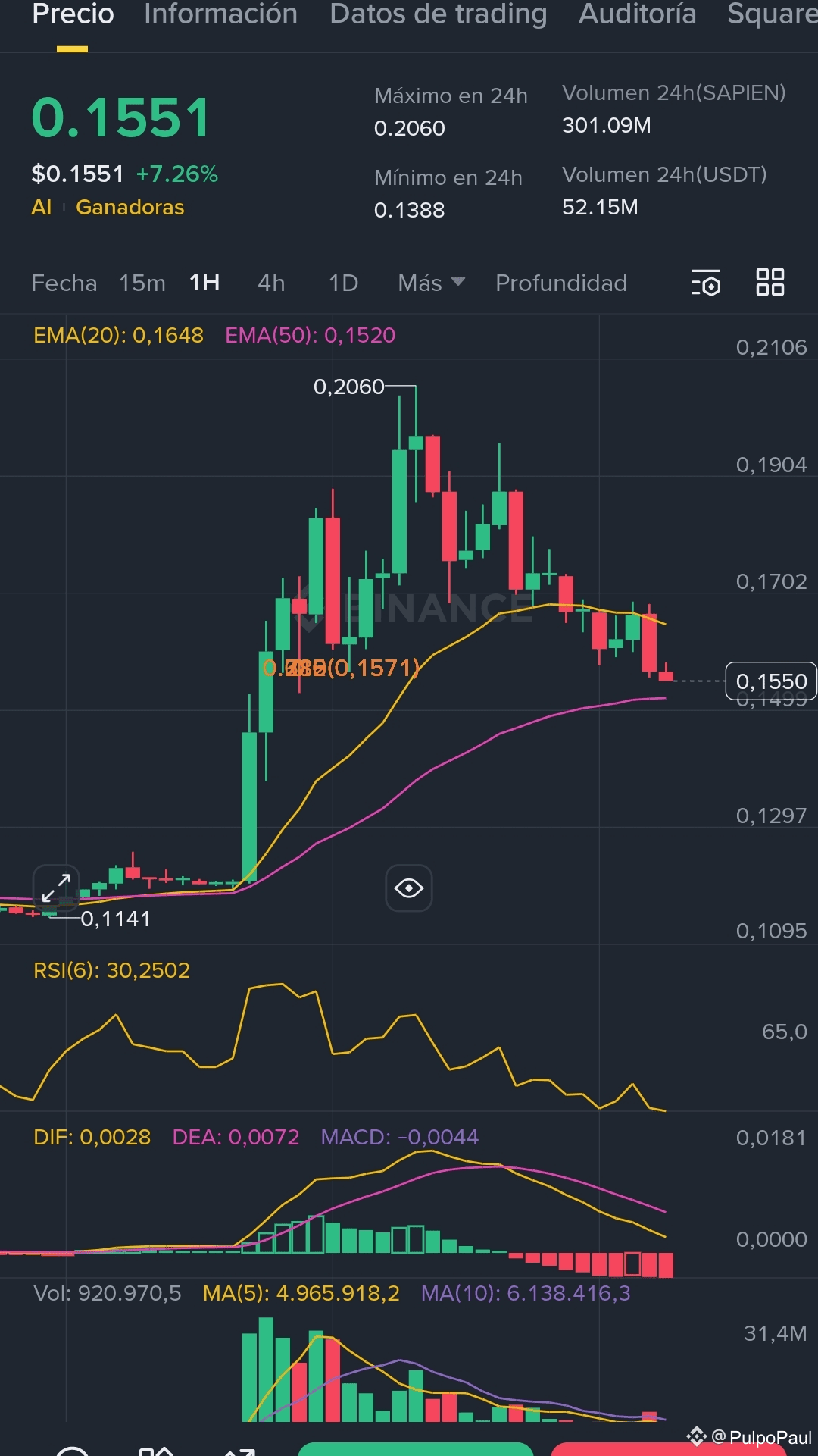 SAPIEN ($0.1551) ha corregido fuertemente en las últimas horas desde su máximo de $0.2060. El volumen sigue siendo alto (52.15M USDT), indicando interés continuo en el activo de IA.