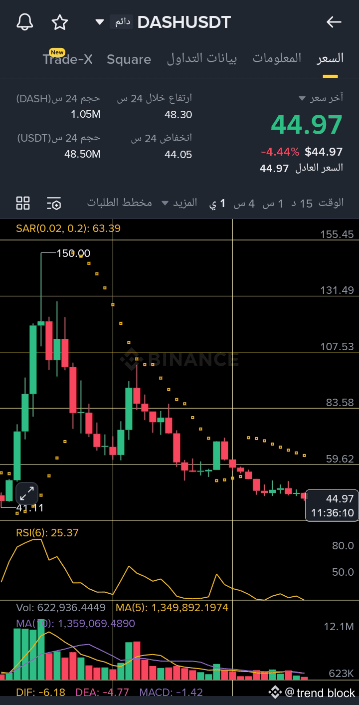 $DASH في الفترة الأخيرة أصبح مستوى 45-44 دولار هو الرقم الذي يراقبه متداولو Dash بدقة. ليس لأنه مجرد سعر، بل لأنه يمثل خط الدفاع الأخير قبل أن تتغير الصورة بالكامل.