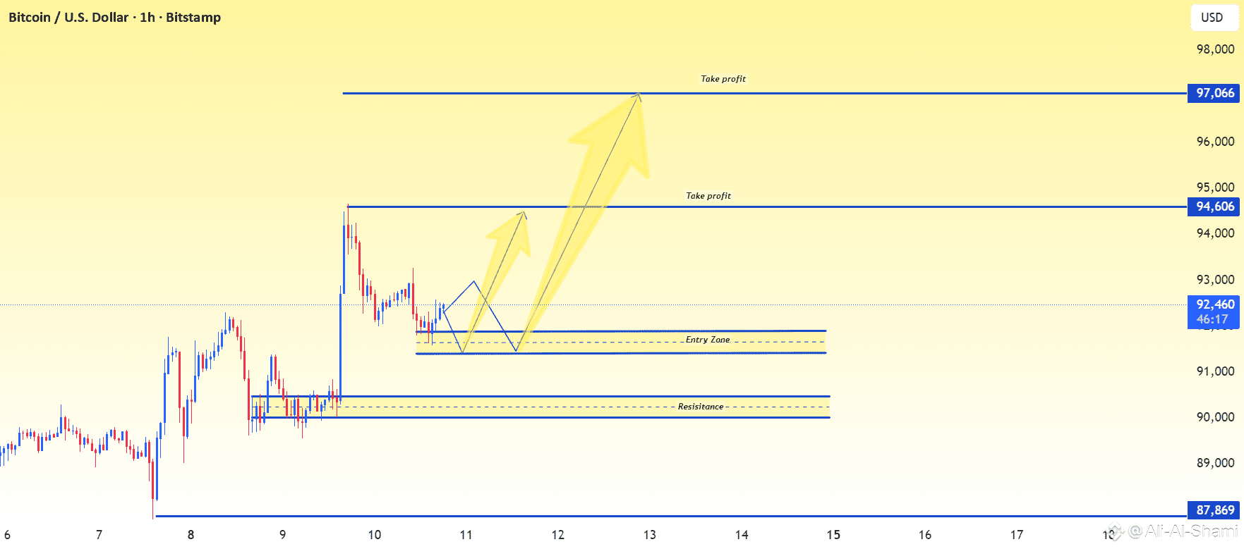 الإطار الزمني: 1H (قصير الأجل) السعر الحالي: $$92,350$