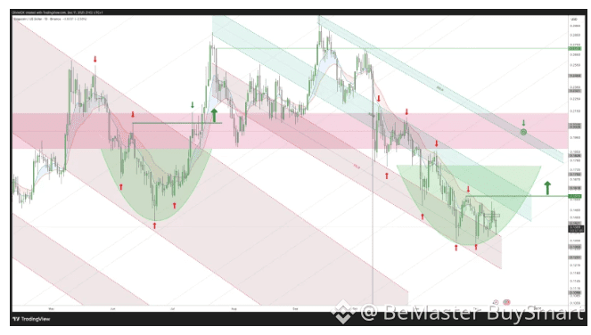 👉 That supply area has capped rallies for months and overlaps with descending channel resistance, making it a double barrier for any meaningful upward move. While a push toward $0.16 might signal improving short-term conditions, the chart makes it clear there's a much bigger obstacle waiting higher up around $0.31—the level where the technical picture actually starts looking promising.