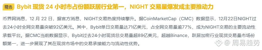 一则数据刷屏:Bybit 在现货交易量上首次超越 Binance,登顶 CMC 24 小时市场份额第一。尤其引人注目的是,这一跃升并非单纯依靠全平台流量堆积,而是由 NIGHT 这一币种的极端活跃交易直接推动——仅 Bybit 一家就承接了 NIGHT 全网超过 77% 的交易量,单日高达 71 亿美元。