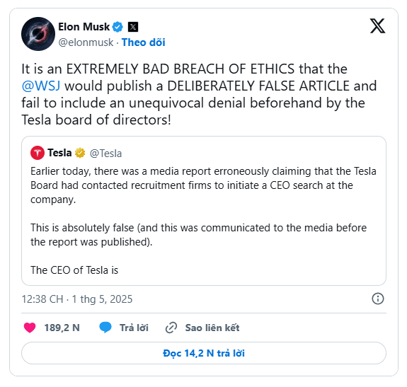 In a scathing post on X, Musk called it a "SERIOUS ETHICAL VIOLATION", accusing the WSJ of ignoring a direct denial from Tesla's board. The report suggested that concerns over Musk's political involvement and distraction among his projects prompted the board to seek a new CEO.