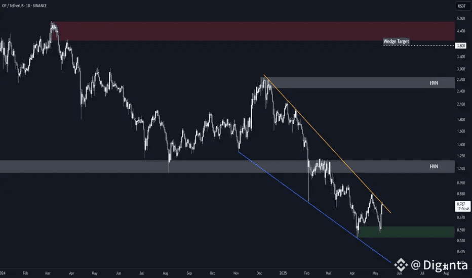 Pattern Formation: OP has been trading within a falling wedge since December 2023, characterized by converging downward-sloping trendlines.