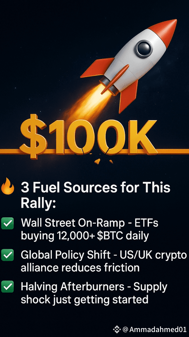 chart with space background and a literal rocket breaking through the $100K barrier] **๐ฅ 3 Fuel Sources for This Rally:**
