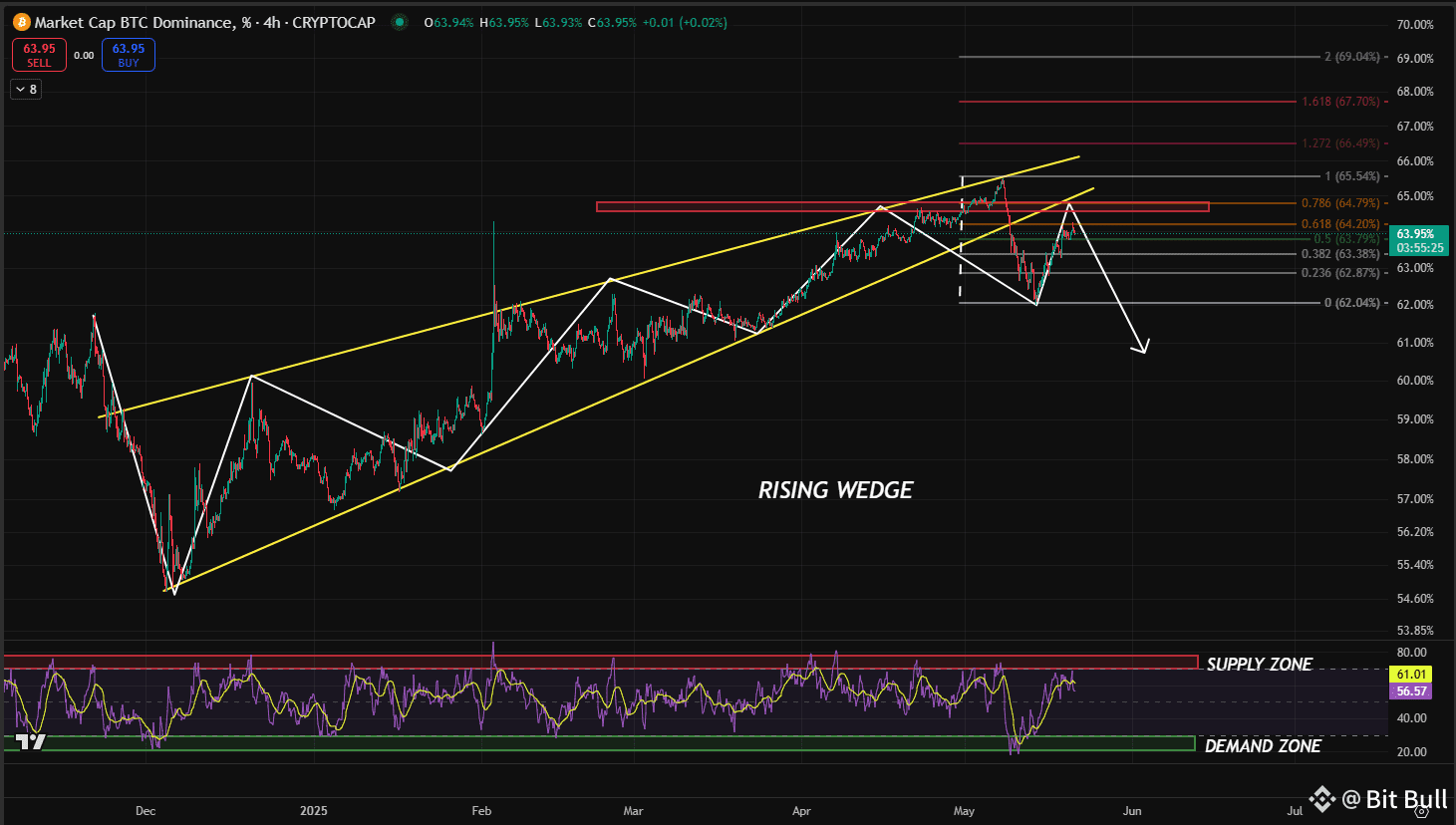 On the 4-hour timeframe, BTC.D has broken down from a rising wedge pattern — a typically bearish formation — and has completed a clean retest of the breakdown level. If BTC.D continues to decline, it could signal increased capital flow into ETH and other altcoins, potentially leading to a strong altcoin rally.