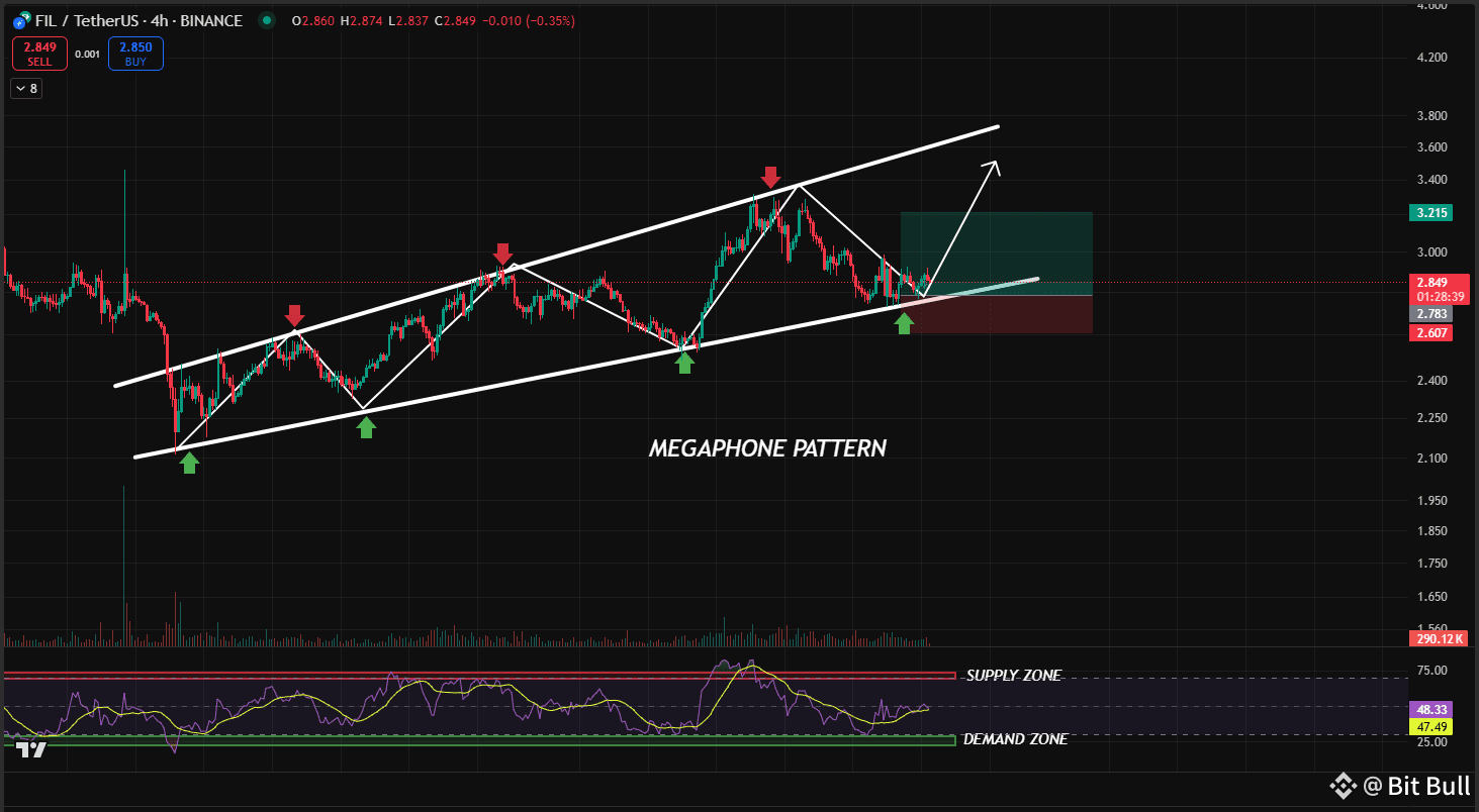 On the 4-hour timeframe, Filecoin (FIL) has formed a megaphone pattern, indicating increased volatility and potential for large price swings. Currently, FIL is holding support at the lower trendline, suggesting possible stability. Additionally, the RSI is maintaining its position in the demand zone, signaling underlying bullish momentum.