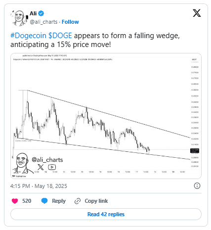 Anonymous analyst Ali_Charts, known for capturing bullish trends, has discovered a descending wedge pattern, a bullish chart pattern that typically forms in a downtrend, on Dogecoin's technical chart. The analyst added that this asset appears to be heading towards a price increase of 15%.